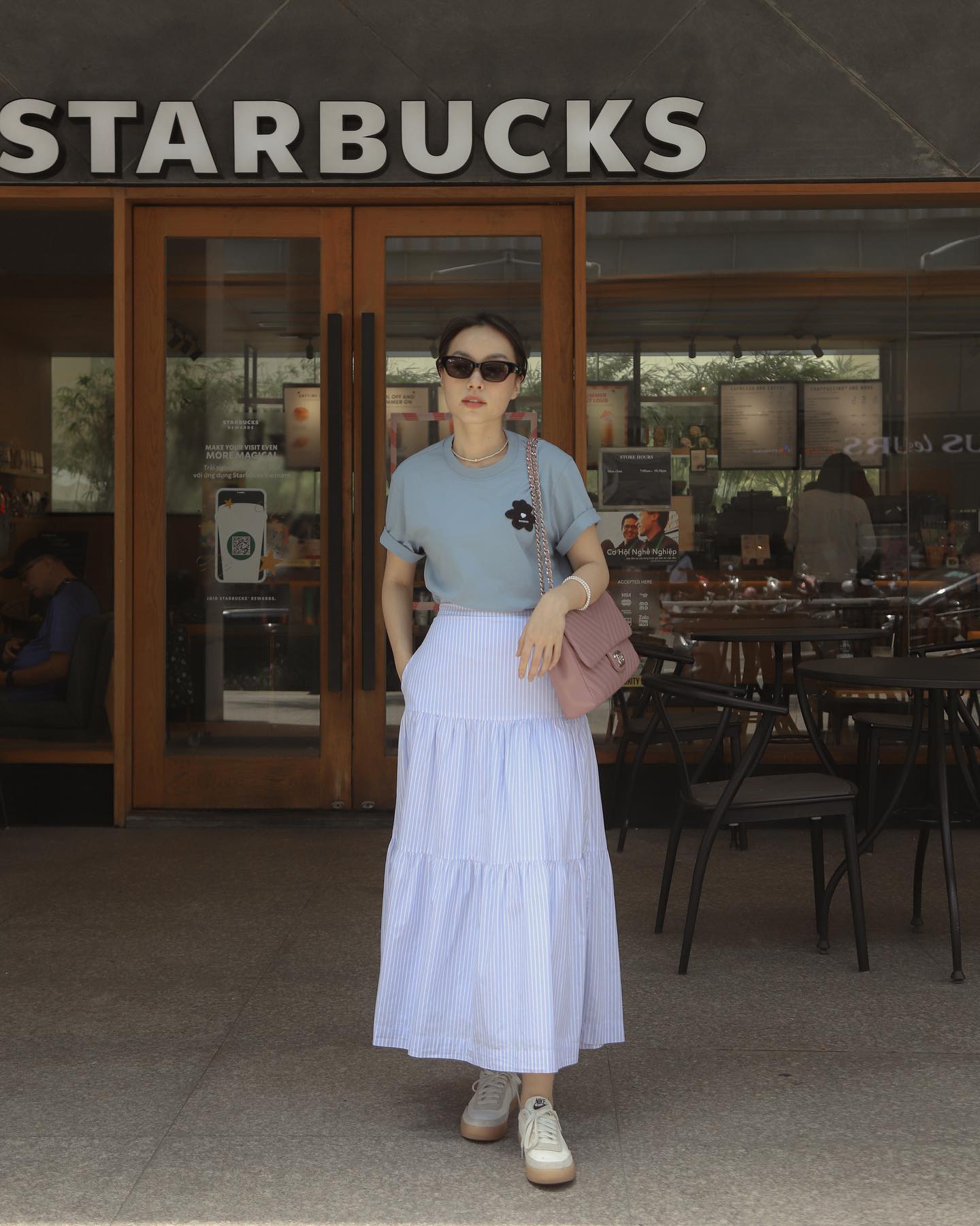 Khi kết hợp cùng giày bệt như giày búp bê gắn nơ mảnh hoặc sneaker trắng, tổng thể trở nên trẻ trung, năng động nhưng vẫn giữ được nét nữ tính. Một mẹo nhỏ thường thấy trong phong cách của Lê Hà Trúc là ưu tiên váy và giày hợp tông màu, tạo cảm giác liền mạch và "ăn gian" chiều cao đáng kể.