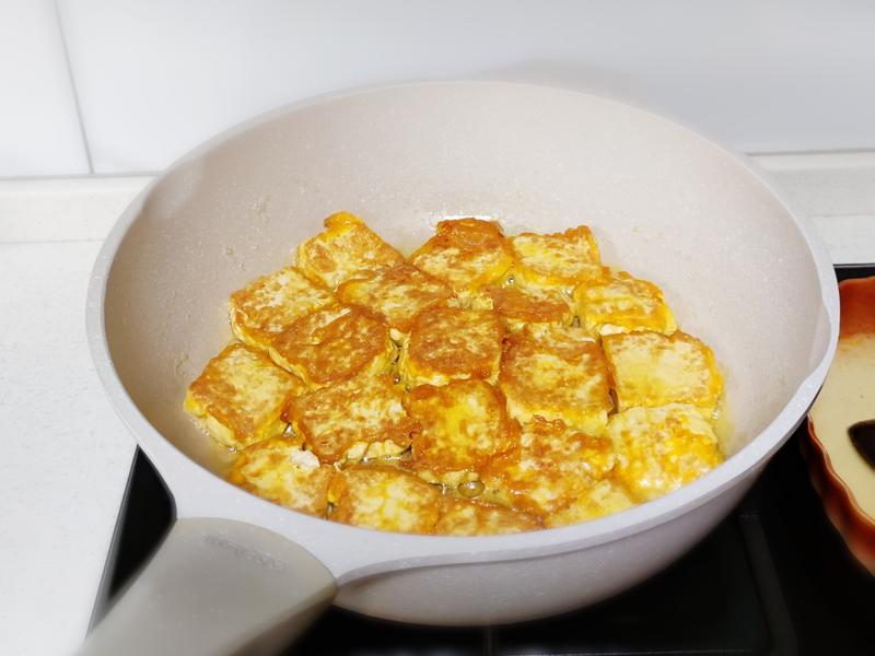Bước 1: Ngâm nấm hương khô trong nước ấm và cắt thành hình chữ thập; ngâm miến trong nước lạnh cho đến khi mềm; cắt đậu phụ thành lát dày 2cm và ngâm trong nước muối khoảng 10 phút để khử mùi tanh; rửa sạch cải thảo rồi cắt thành các khúc ngắn. Phết một lớp dầu mỏng lên chảo và chiên đậu phụ cho đến khi vàng đều hai mặt.