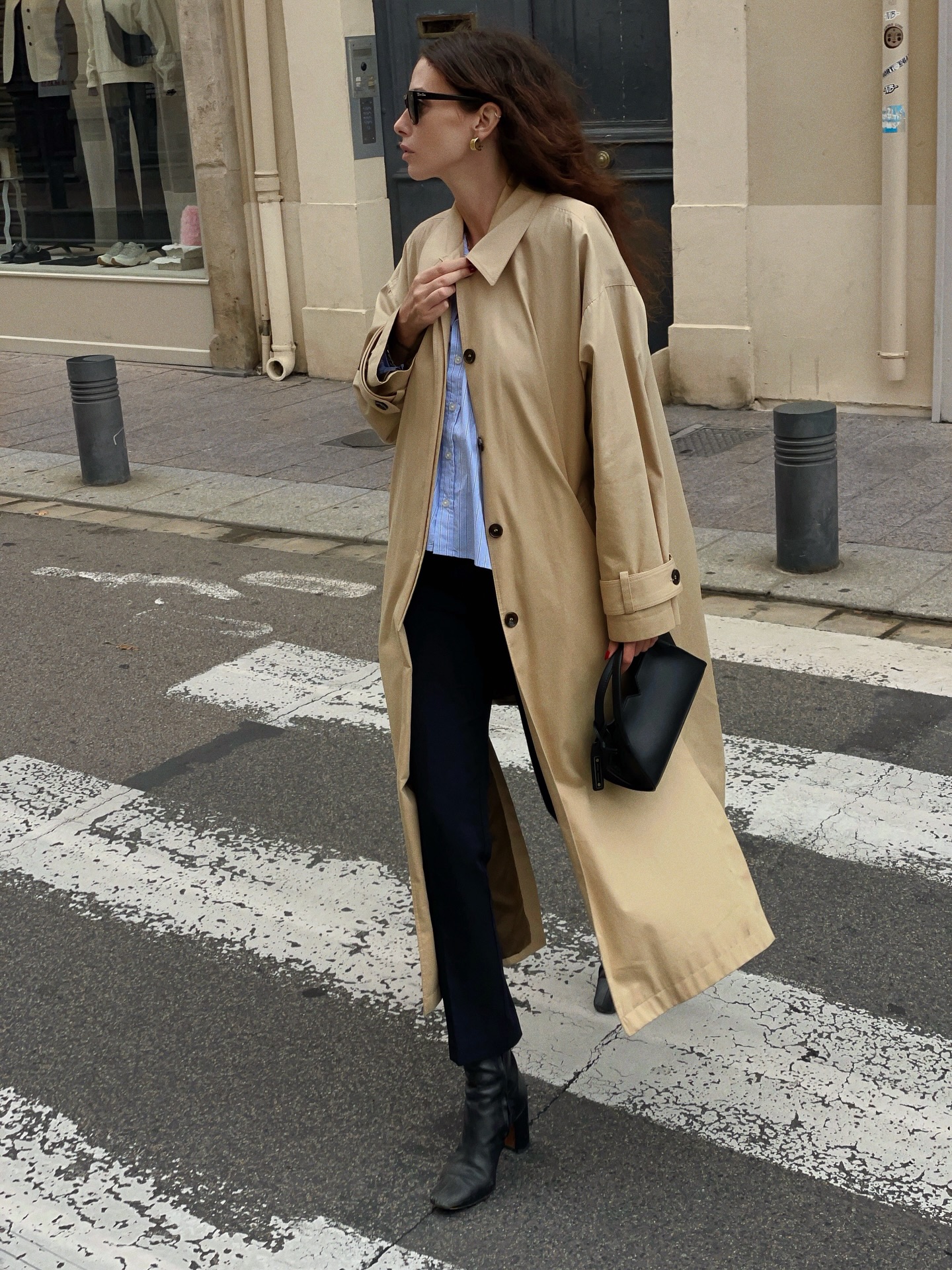 Màu sắc của áo trench coat thường là những tông màu trung tính như be, xám, xanh navy, mang lại vẻ ngoài sang trọng và dễ phối đồ. Một chiếc áo trench coat có thể mặc trên nhiều lớp trang phục khác nhau, từ áo len đơn giản, cho đến những bộ đồ công sở trang nhã. Khi mặc áo trench coat, phụ nữ Pháp luôn kết hợp với phụ kiện như giày boots hoặc một chiếc túi xách nhỏ xinh, tạo nên sự hoàn hảo cho bộ trang phục.