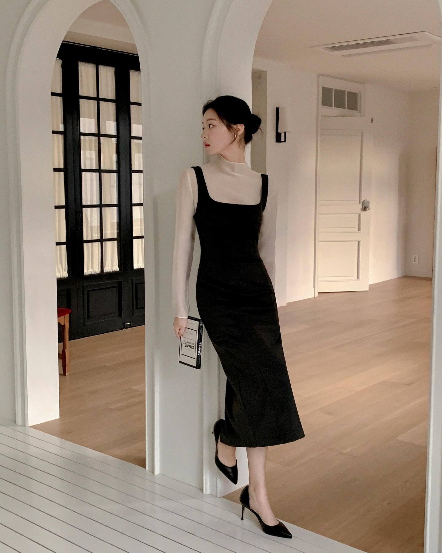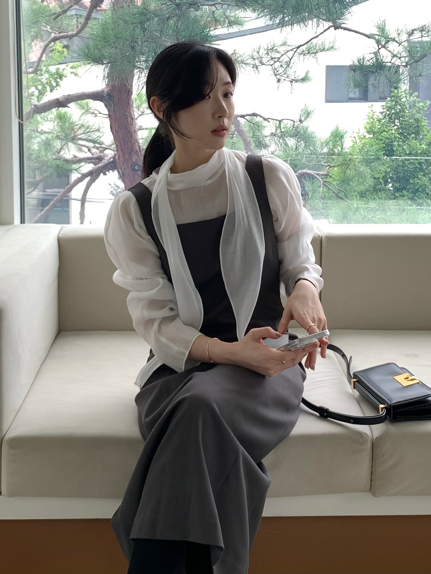 Không chỉ đẹp, váy gile còn được yêu thích nhờ tính ứng dụng cao. Một set váy gile hoàn toàn có thể theo bạn từ công sở ra phố mà không cần thay trang phục. Khi đi làm, chỉ cần phối váy gile cùng áo sơ mi trơn màu, giày cao gót hoặc loafer là đã đủ lịch sự, chuyên nghiệp. Đến khi tan ca, bạn chỉ cần đổi sang một đôi ankle boots hoặc sneaker, thêm chiếc túi xách nhỏ xinh là có thể tự tin dạo phố, cà phê cùng bạn bè.