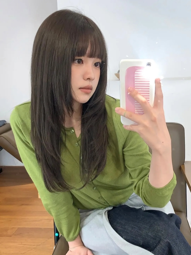 Cuối cùng là mái bằng kiểu Hàn – tưởng quen mà lại rất mới. Không còn kiểu mái cắt dày, bằng và nặng nề như trước, phiên bản hiện đại hướng đến sự thoáng nhẹ, có độ tơi nhất định để tạo cảm giác trẻ trung mà không “ngố”.