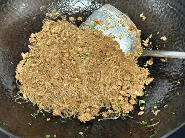 Bước 3: Sau đó bạn nêm thêm chút muối và nhanh chóng xào đều. Đảo nhanh tay để sợi miến thấm các gia vị và được trộn đều với thịt băm. Sau cùng khi thấy miến đã ráo nước, bạn rắc hành lá thái nhỏ vào, đảo đều 2-3 lần là có thể lấy ra đĩa.