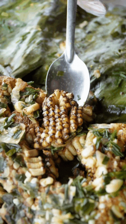 Tiktoker Mai Thơm Chuyện Vùng Cao đã chia sẻ cách làm món nhộng ong khoái nướng của mình chỉ với một vài nguyên liệu đơn giản. Củ kiệu mang thái nhỏ, rưới đều lên 2 mặt của nhộng ong, thêm chút gia vị và gói bằng là chuối, kẹp que tre và nướng đều 2 mặt. Video chia sẻ công thức nhộng ong khoái nướng này đã thu hút hơn 9,3 triệu lượt xem trên Facebook.