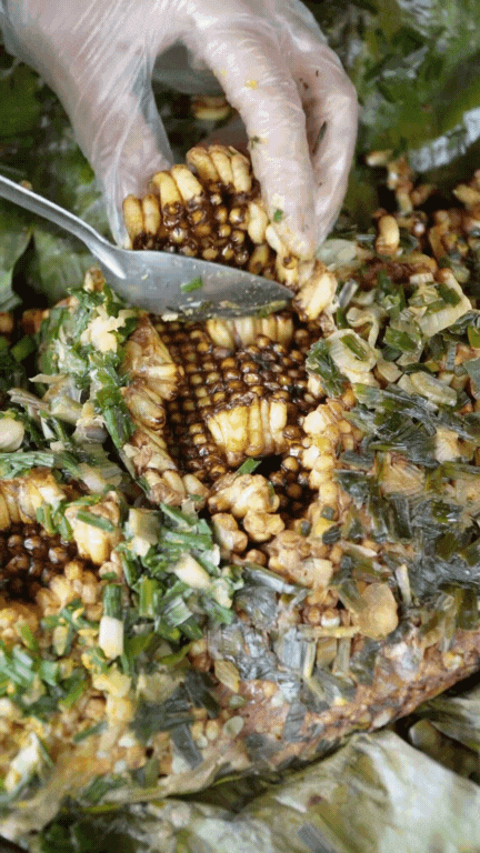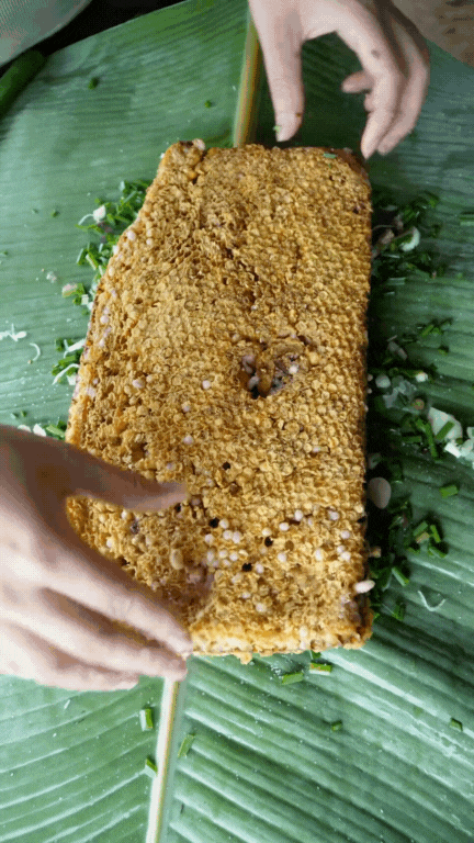 Nhộng ong khoái có thể chế biến nhiều kiểu, nhưng nướng là cách phổ biến và “đậm chất rừng” nhất. Người dân địa phương chọn những mảng tổ ong có nhiều nhộng béo, đặt lên lá chuối rồi gói kín, kẹp giữa hai thanh tre, nướng trên than hồng. Mùi khói len lỏi vào từng ô sáp, làm chảy mật ong hòa cùng chất béo tự nhiên của nhộng. Khi nướng vừa chín tới, nhộng ong căng mọng, da bóng nhẹ, cắn vào là vị béo bùi tràn ra, thơm nức mà không hề tanh. Mùi khói nhẹ, vị ngọt thanh của mật, chút giòn của sáp ong cháy xém, tất cả tạo nên hương vị “nguyên sơ” chỉ có thể tìm thấy giữa đại ngàn.