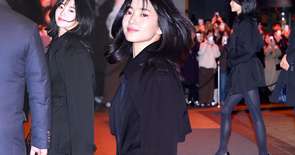 Kim Tae Ri diện combo all-black với áo trench coat kết hợp quần tất xuyên thấu và giày cao gót mũi nhọn - công thức lên đồ ăn cưới tối giản và tinh tế của các ngôi sao Hàn Quốc. Điểm đắt giá nhất nằm ở mái tóc: không tạo kiểu cầu kỳ mái tóc đen buông nhẹ của Kim Tae Ri được thả bồng bềnh tự nhiên, tạo nên cảm giác vô cùng "điện ảnh".