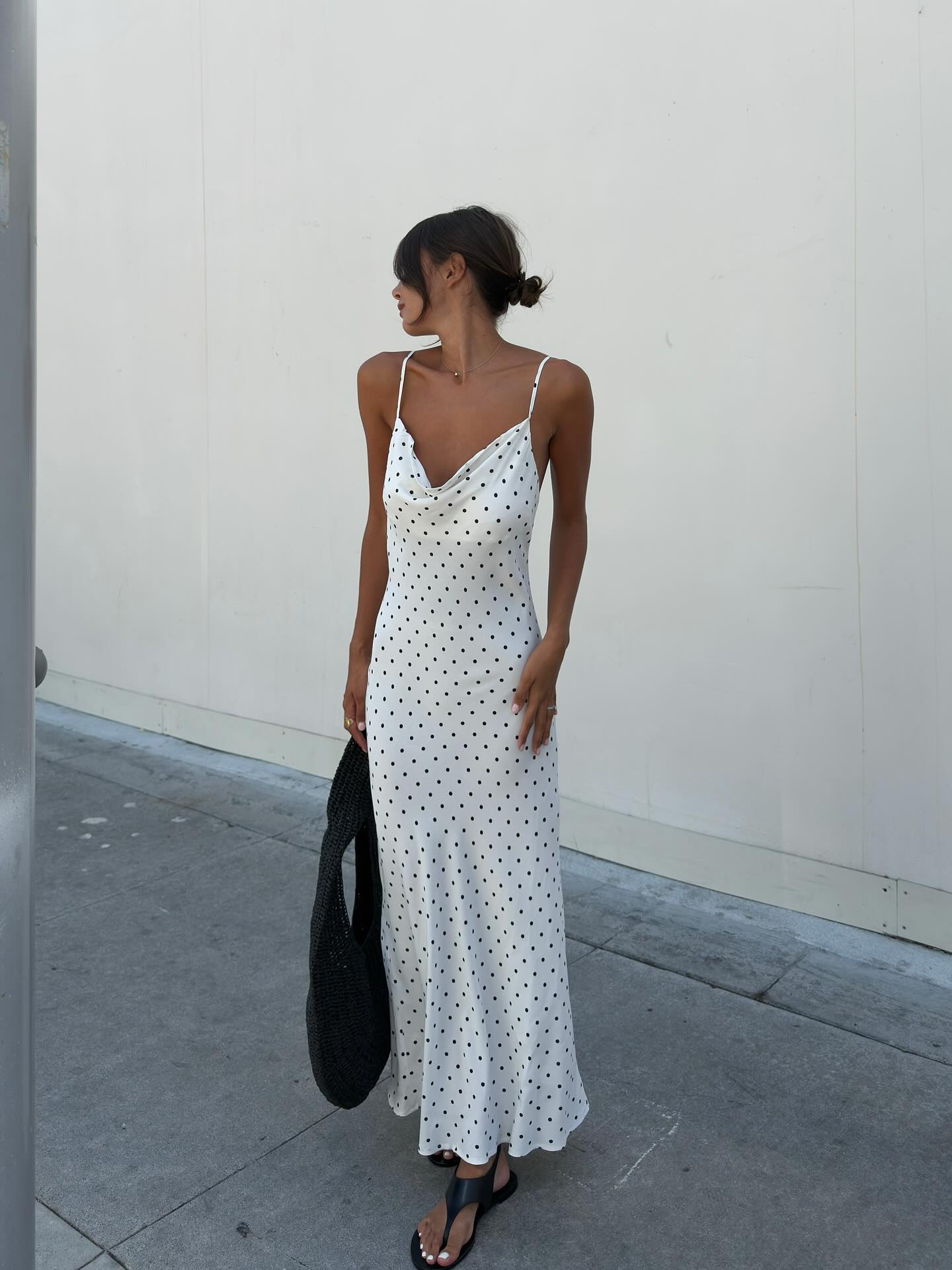 Váy lụa mang lại cảm giác mềm mại và thoáng mát, vì vậy đây là kiểu váy thường xuất hiện trong tủ đồ mùa hè của nhiều phụ nữ Pháp. Những thiết kế phổ biến nhất là váy hai dây với phom dáng ôm nhẹ cơ thể.