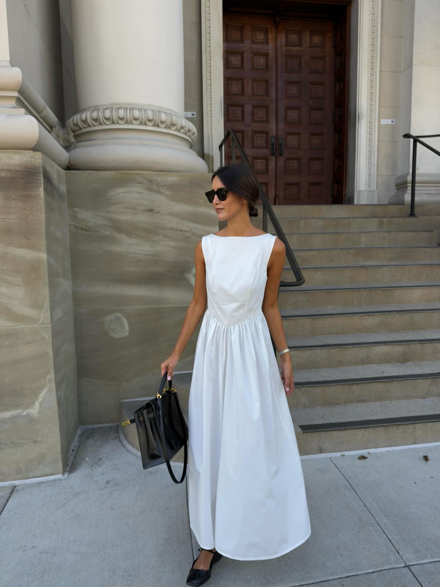 Váy trắng là lựa chọn quen thuộc mỗi khi mùa hè đến. Màu trắng tạo cảm giác mát mẻ, sáng sủa và dễ kết hợp với nhiều phụ kiện khác nhau. Với phụ nữ Pháp, đây là kiểu váy thường được mặc trong những buổi dạo phố cuối tuần hoặc trong các chuyến nghỉ hè.