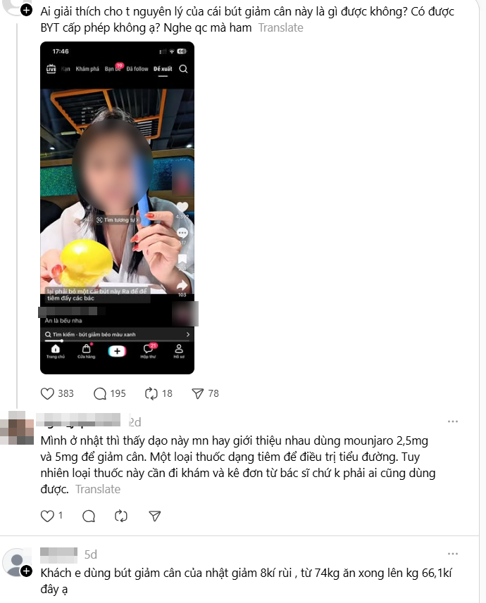 Không chỉ trao đổi kinh nghiệm, việc mua bán cũng diễn ra khá công khai. Nhiều tài khoản quảng cáo sản phẩm có nguồn từ Nhật, Mỹ hoặc châu Âu, bán theo hộp hoặc theo từng cây bút tiêm.
