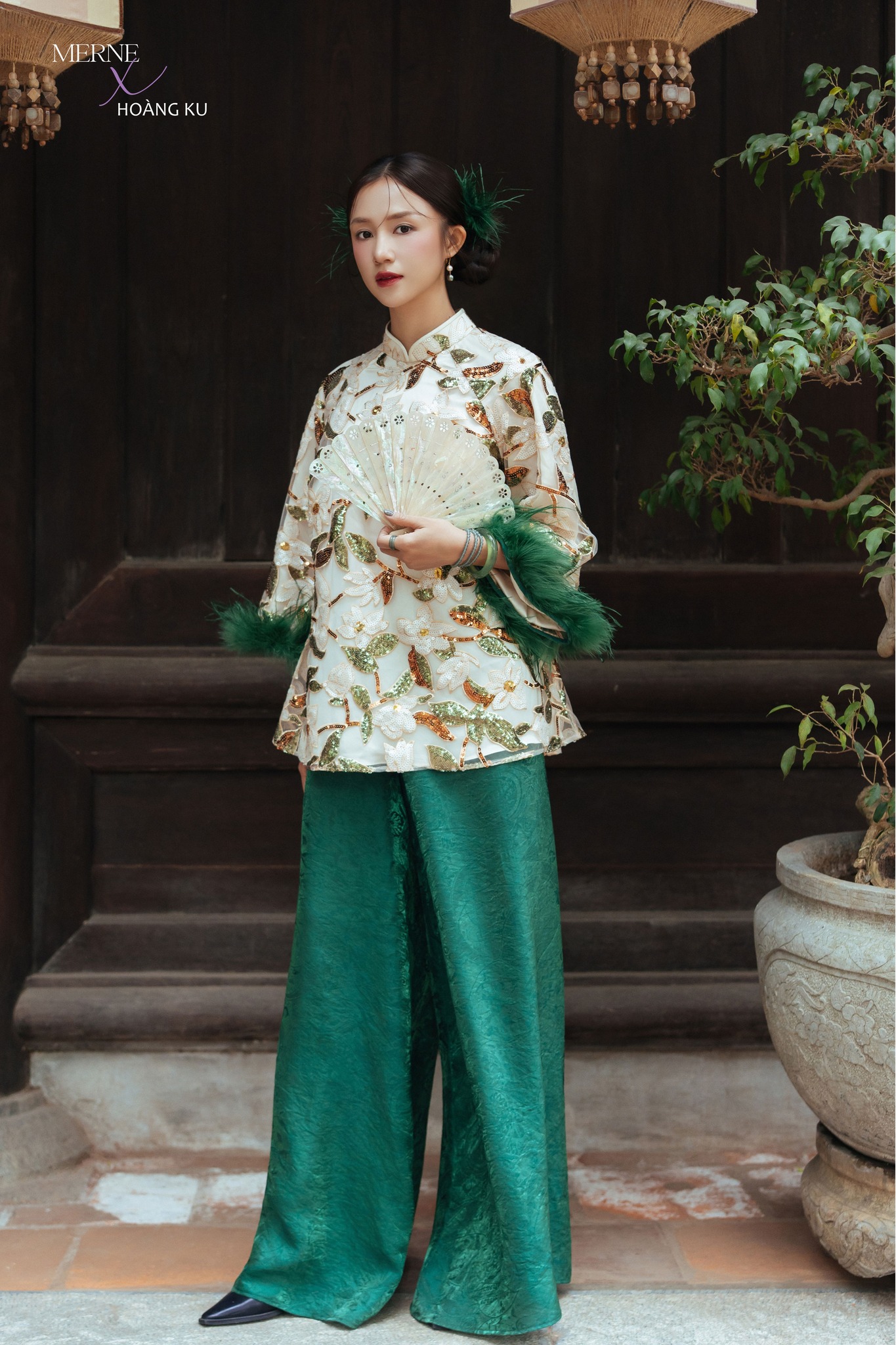 Thiết kế của MERNE gây ấn tượng mạnh với set đồ mẹ bé diện Tết đầy tinh tế, trong đó bé như một phiên bản nhí đáng yêu của mẹ với những set đồ đôi đồng điệu.