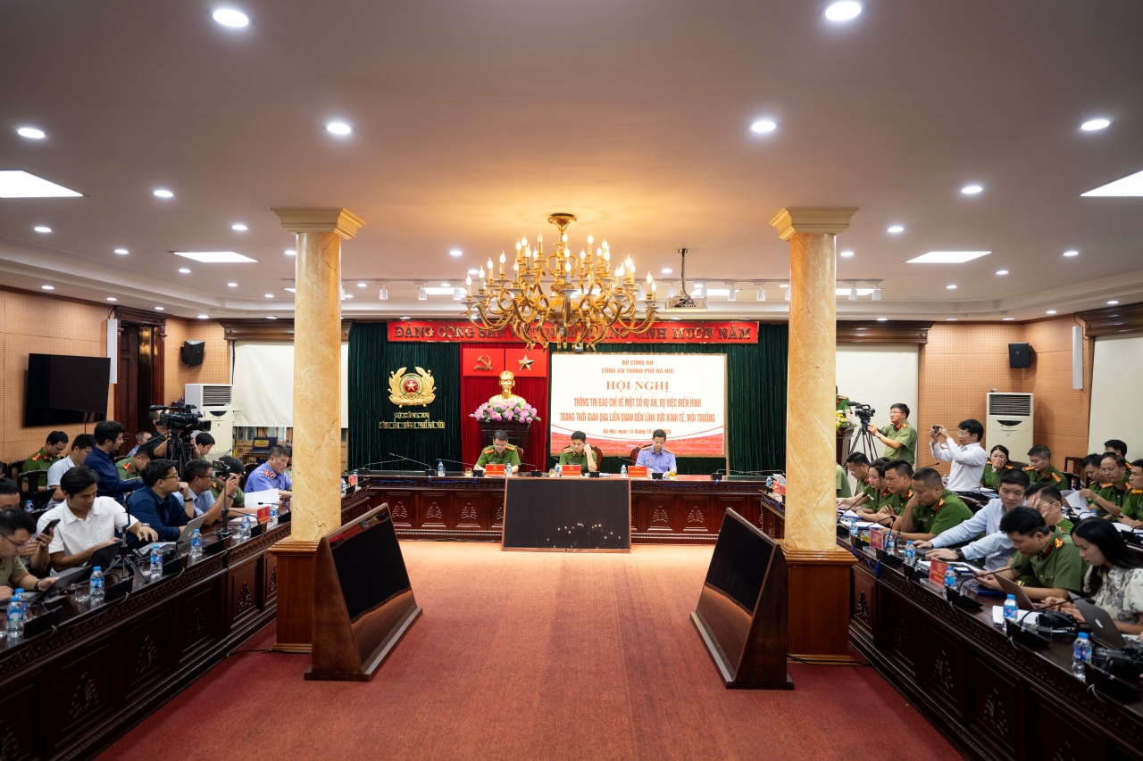 Toàn cảnh buổi họp báo thông tin kết quả điều tra, khám phá một số vụ án, vụ việc điển hình trong thời gian qua. Ảnh: Như Hoàn