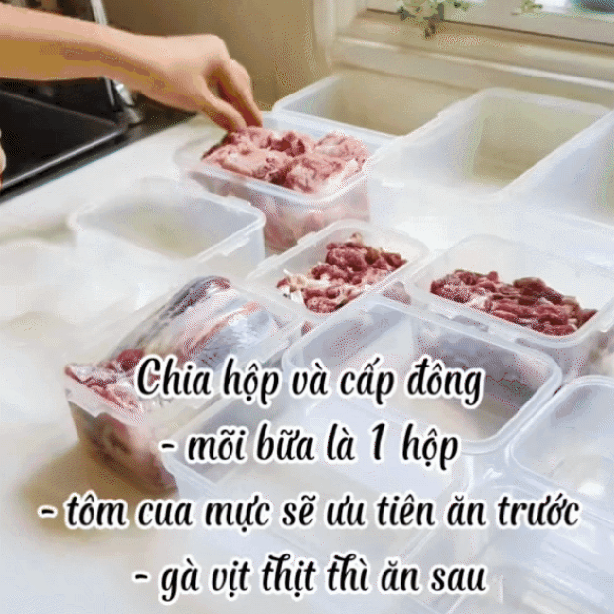 "Cá thịt khi mua về mình sẽ rửa sạch, sát muối, chanh, sau đó cắt thành từng miếng nhỏ rồi chia vào từng hộp, mỗi hộp đủ nấu một bữa ăn cho cả nhà. Có một số món mình sẽ sơ chế trước. Đóng hộp cẩn thận, nếu bạn không nhớ thì có thể dán nhãn để phân biệt. Còn mình quen rồi nên xếp các hộp giống nhau vào cùng một bên. Tôm mực sẽ ưu tiên ăn trước, rồi đến thịt gà vịt ăn sau, trứng để dành cho những bữa nhỏ" - người vợ chia sẻ.