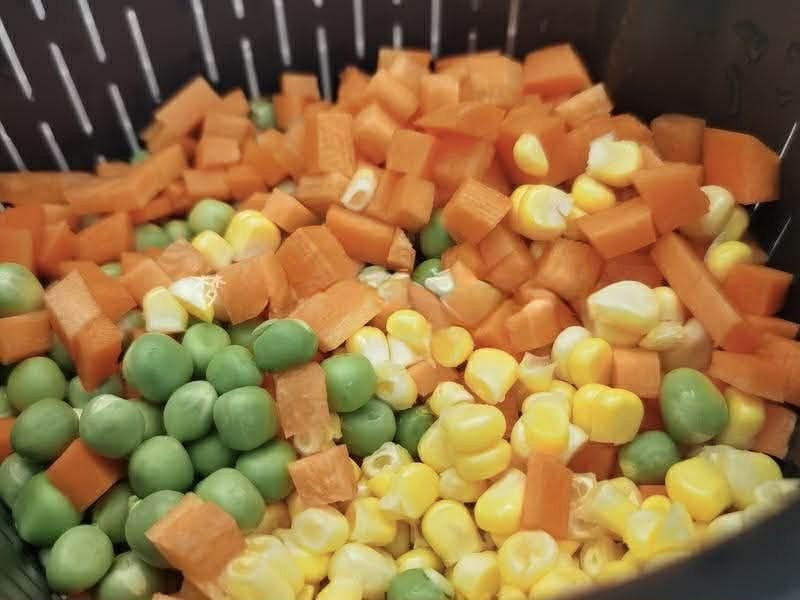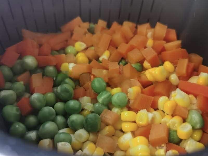 Bước 2: Cho ngô ngọt, đậu Hà Lan và cà rốt cắt hạt lựu vào xửng hấp. Đun sôi nước trong nồi hấp rồi đặt xửng hấp lên, hấp các nguyên liệu trong khoảng 6 phút. Khi hết thời gian, lấy ngô ngọt và đậu Hà Lan ra khỏi xửng.