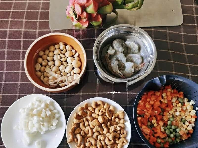 6-8 con tôm, 50g hạt ngô ngọt tươi, 50g đậu Hà Lan, 1/4 củ cà rốt, 6 củ mã thầy, 1 quả thanh long, 50g hạt điều rang, 80g hạt mắc ca, lượng dầu ăn thích hợp, một chút muối, 1 thìa cà phê rượu nấu ăn, 1 thìa cà phê tinh bột bắp.