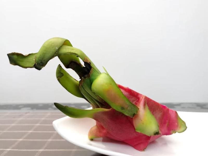 Bước 4: Sau khi xào các nguyên liệu hoàn thành, bạn đặt phần vỏ của quả thanh long lên đĩa sao cho phần cuống chạm vào đáy đĩa, phần đuôi có lá dài hướng lên trên. Sau đó bạn dùng thìa xúc nguyên liệu đổ vào phần vỏ quả và đĩa rồi tạo hình sao cho giống một "suối" vàng bạc đang chảy ra từ miệng núi.