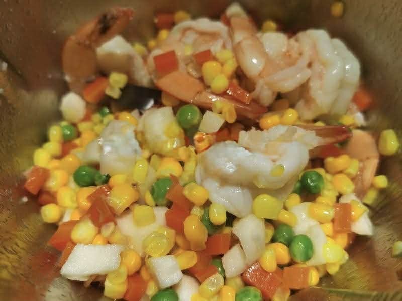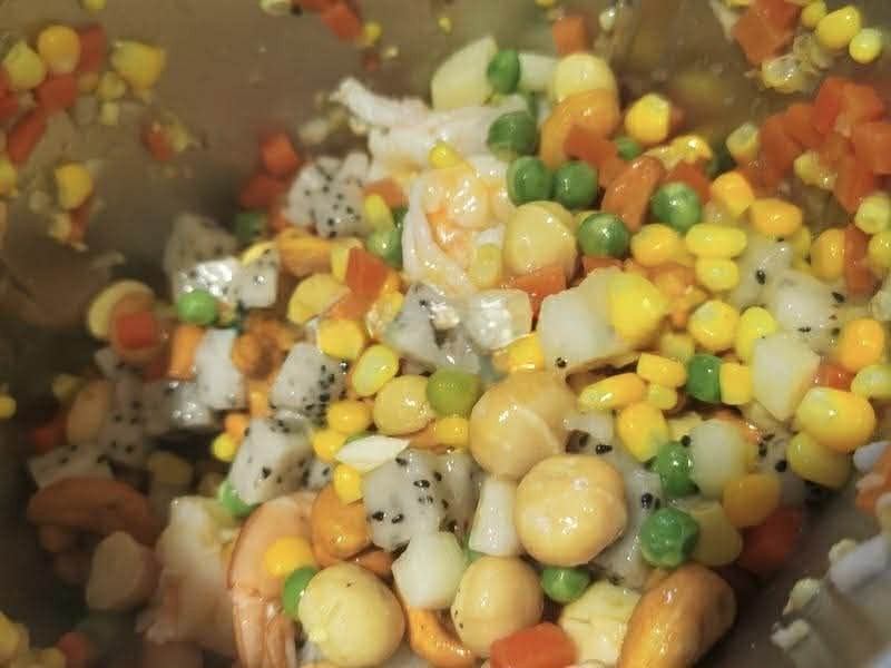 Bước 1: Sơ chế tất cả các nguyên liệu. Bóc vỏ, rửa sạch rồi dùng dao rạch dọc sống lưng tôm, rút chỉ tôm. Sau đó cho vào bát, ướp tôm với rượu nấu ăn, một chút muồi và tinh bột bắp. Sau đó rửa sạch và để ráo. Cà rốt và củ mã thầy đem gọt bỏ vỏ, rửa sạch rồi thái hạt lựu. Ngô ngọt và đậu Hà Lan rửa sạch, để ráo nước. Rửa sạch quả thanh long và bổ đôi theo chiều dọc. Dùng thìa múc phần thịt quả ra và thái hạt lựu (chỉ cần phần thịt của nửa quả là đủ), để riêng.