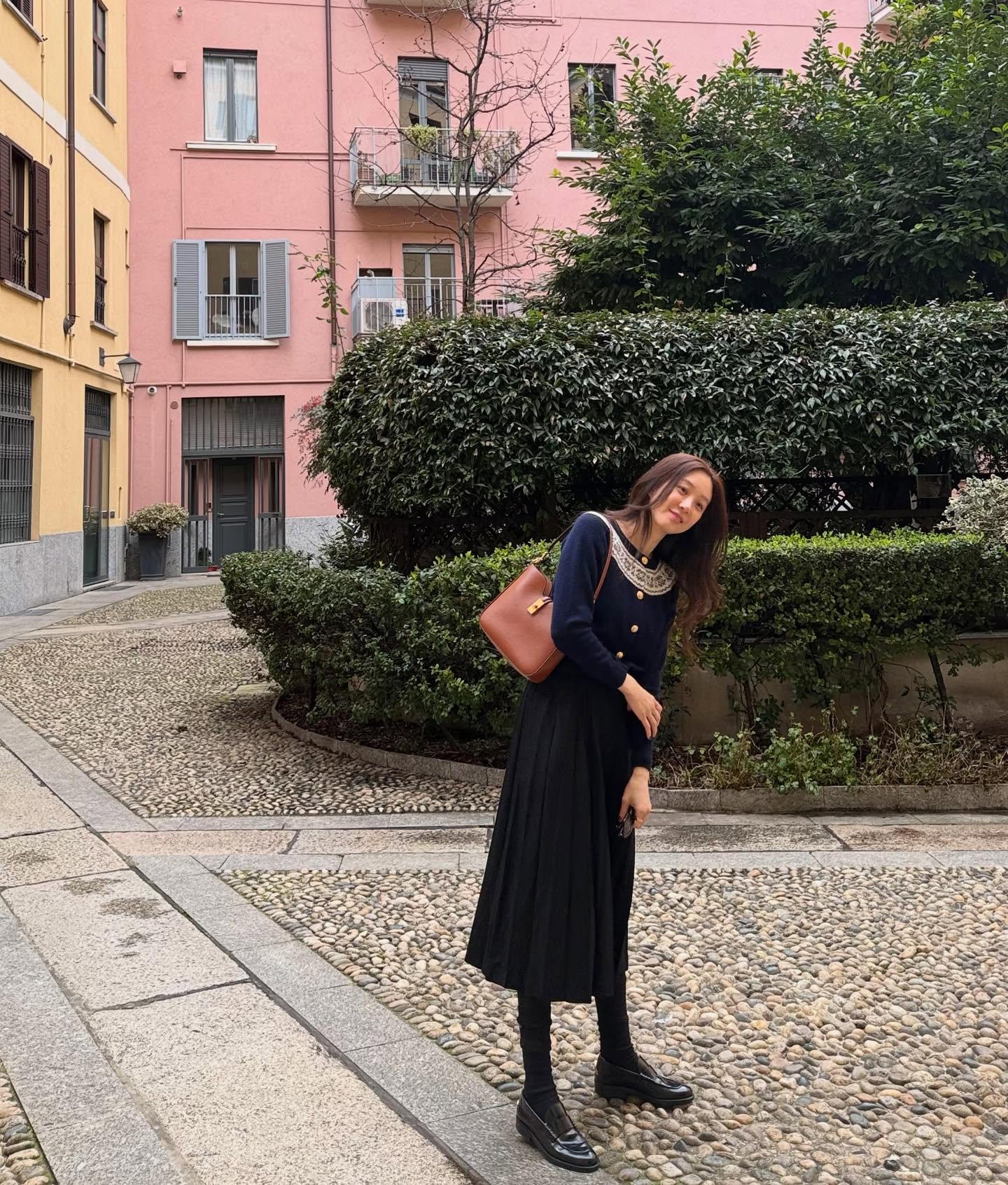 Dì tôi cũng rất yêu thích chân váy đen, đặc biệt là kiểu dáng bí ngô, với phần túi nhấn và độ dài vừa phải, kết hợp cùng những chiếc áo len tông màu trung tính như ghi, nâu hay trắng. Mặc dù diện đồ đen, nhưng dì vẫn giữ được vẻ trẻ trung nhờ vào việc lựa chọn kiểu dáng và phụ kiện phù hợp, chẳng hạn như một chiếc túi xách màu sắc nổi bật hoặc đôi giày boots hiện đại.