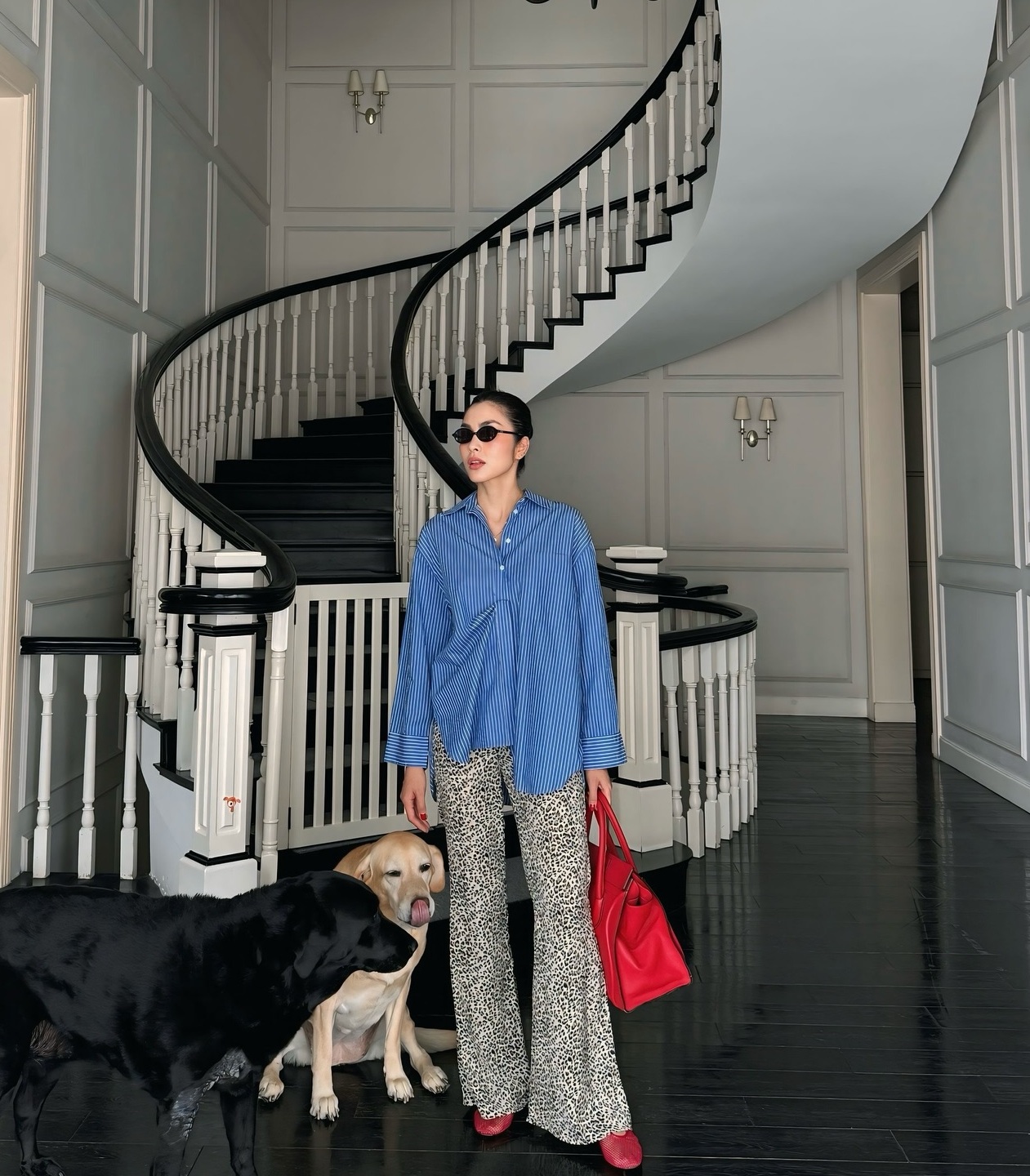 Style của Tăng Thanh Hà có điểm rất khác biệt so với nhiều nàng dâu hào môn khác, đó chính là sự năng động, cá tính. Mỹ nhân 39 tuổi hiếm khi chọn các bộ cánh nhẹ nhàng, điệu đà xuống phố. Cô ưu tiên những cách phối đồ khá hiện đại như áo khoác da + quần jeans xanh, áo gile và quần tây hay áo sơ mi oversized kết hợp với quần da báo…