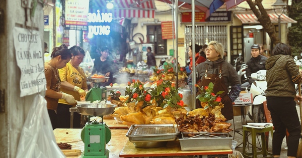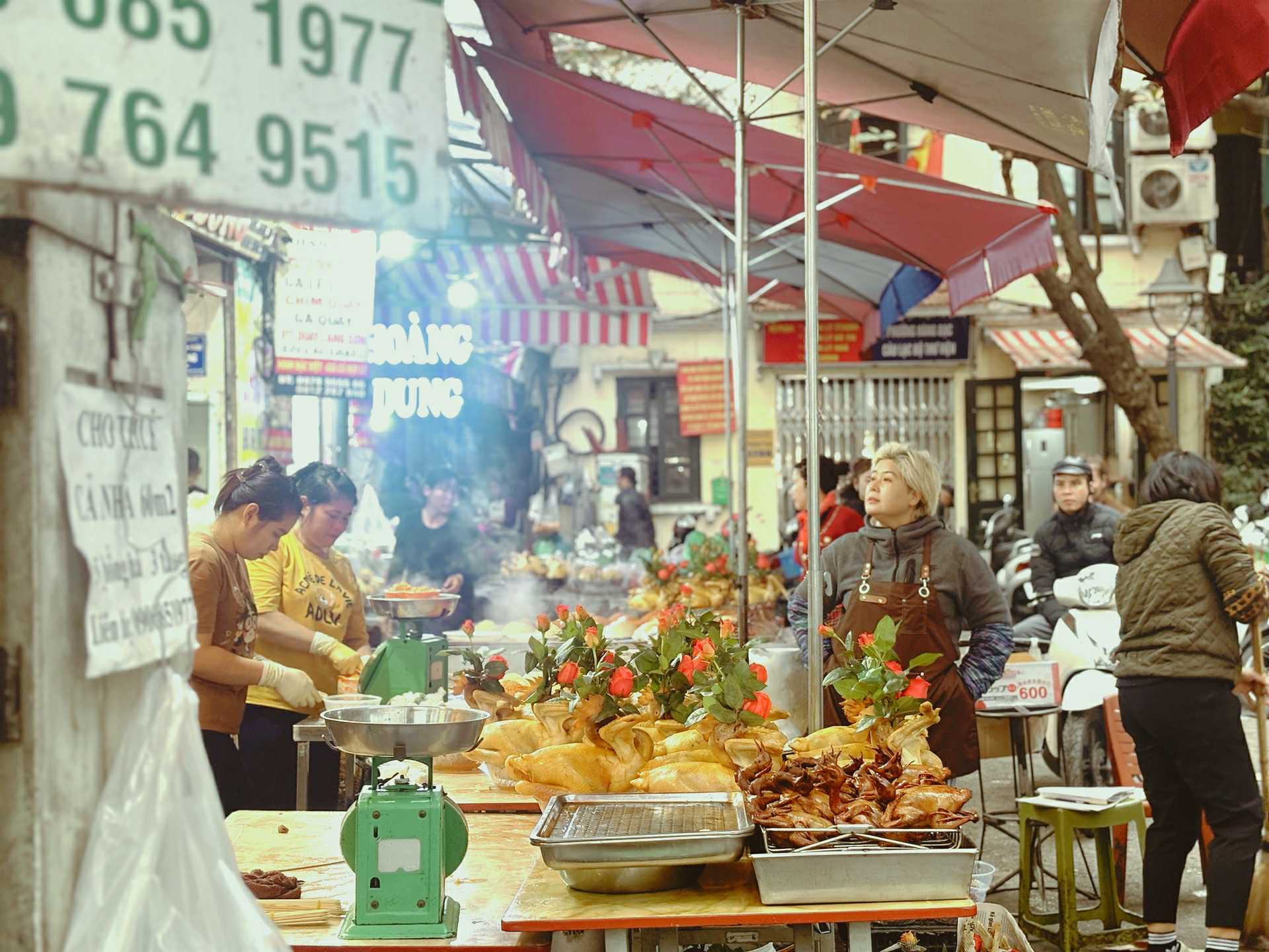 Đông vui nhất vẫn là khu bán gà luộc - nơi năm nay ngoài gà và xôi truyền thống, các tiểu thương còn có thêm nhiều món mặn hấp dẫn như bò lúc lắc, tôm chiên, chim quay. Giá cả năm nay khá “dễ chịu”, thậm chí có phần rẻ. Một vị khách chọn mua một con gà luộc ngậm hoa hồng và một phần bò lúc lắc, tổng cộng chỉ 1,2 triệu đồng – trong khi năm ngoái, riêng con gà luộc ngày 30 Tết đã lên tới 1,1 triệu.