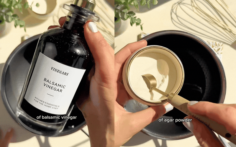 Hãy lưu ngay bí kíp làm "trân châu giấm đen Balsamic" đầy tinh tế này cho bữa tiệc sắp tới, chắc chắn các vị khách sẽ phải trầm trồ không tin rằng chính tay bạn đã tạo ra chúng. Để thực hiện, bạn chỉ cần hòa tan khoảng một chén giấm Balsamic với một muỗng cà phê bột rau câu giòn (agar), có thể ước lượng bằng mắt mà không cần quá chính xác rồi đun liu riu trên bếp khoảng 1-2 phút để kích hoạt độ kết dính của agar trước khi nhấc xuống.
