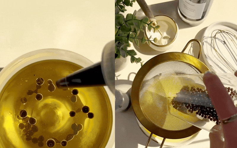Tiếp theo, chuẩn bị một ly đầy dầu thực vật đã được làm lạnh sâu (tốt nhất là để trong ngăn đông khoảng 30 phút), từ từ nhỏ từng giọt giấm vào ly dầu theo chuyển động tròn từ trên cao xuống để tạo hình viên tròn đều đẹp mắt.