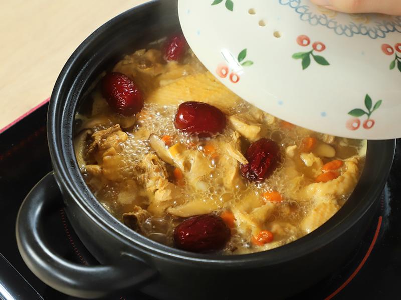 Bước 2: Tiếp theo, bạn cho thịt gà vào nồi, thêm hoàng kỳ, nấm đông trùng hạ thảo, nấm hương thái lát và khoảng 600ml nước vào nồi đất nung. Đậy nắp nồi đất và đun nhỏ lửa trên bếp điện từ ở mức trung bình trong 30 phút. Mở nắp nồi đất, sau đó đổ táo đỏ và kỷ tử vào. Đậy nắp nồi và tiếp tục ninh nhỏ lửa trong 15 phút, nêm nếm gia vị vừa ăn. Sau đó tắt bếp, là món canh gà đã sẵn sàng!